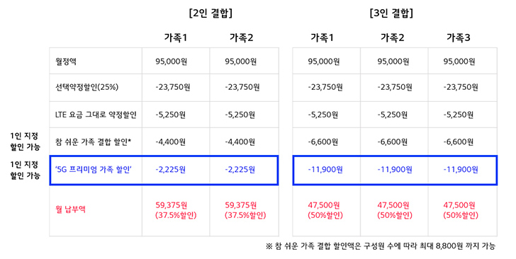 그런데 여기에서 재미있는게 5G 프리미엄 가족 할인이 추가되어서 추가할인을 제공해주고 있습니다.