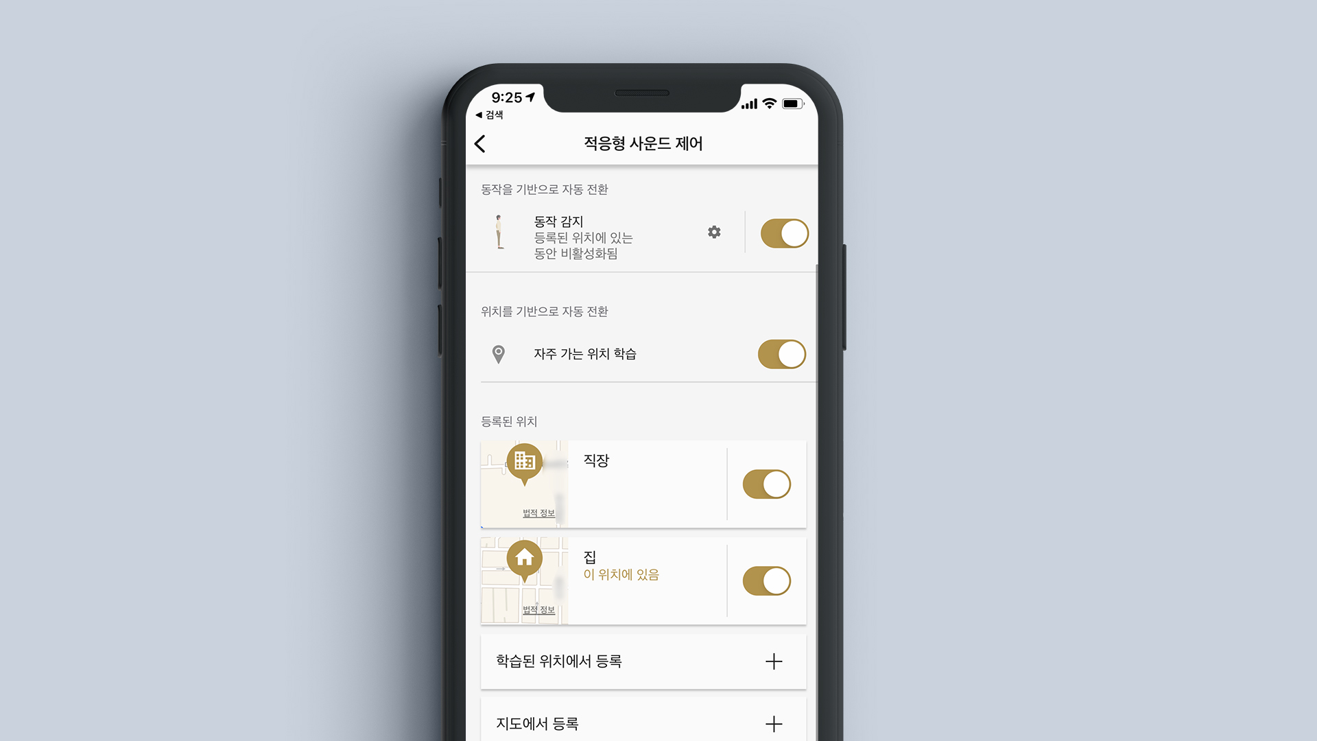 앱을 통해 내가 옮겨다니는 위치들을 학습하여 그 위치에 따라 헤드폰 설정을 자동으로 변경해주는 기능인데요. 학습하는 것이 싫다면 내가 위치와 범위들을 직접 등록하여 소니헤드폰을 각각의 장소에 맞게 최적화하는 것도 가능합니다.