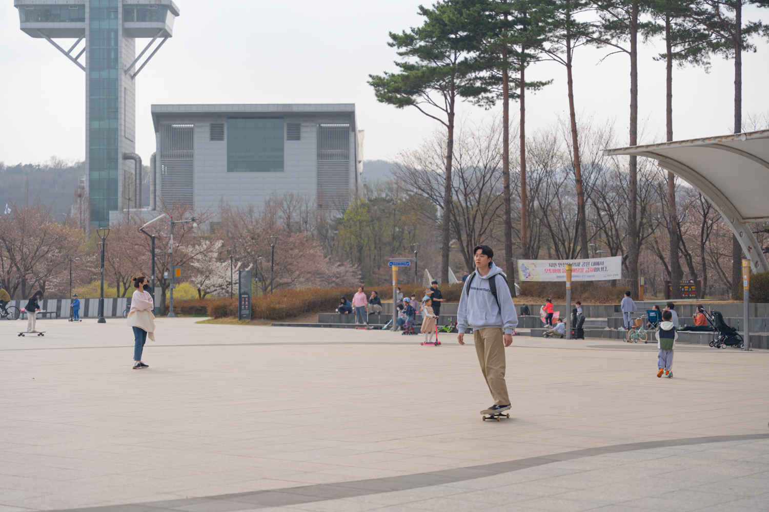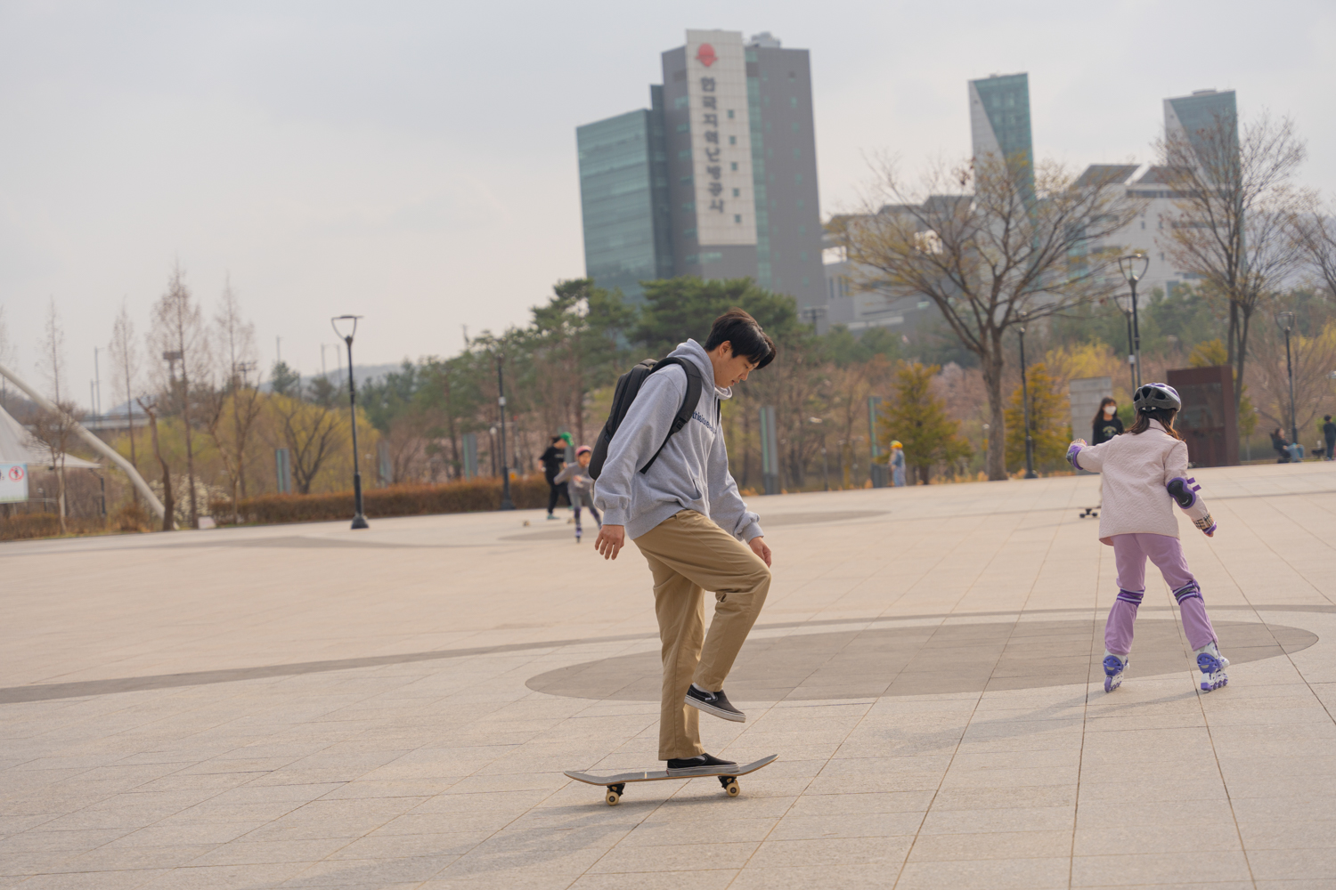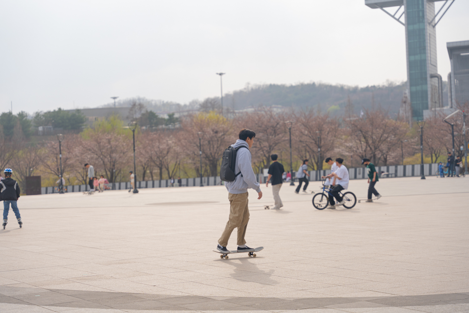 가방을 메고 탔을 때, 거추장스러운게 없다라고 해야할까요? 보통 스케이트보드를 타게 되면 온 몸을 사용하기 때문에 양 팔이 가방에 닿을 수 밖에 없어요.
